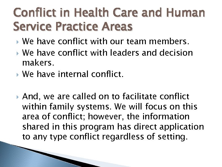 Conflict in Health Care and Human Service Practice Areas We have conflict with our team members. We have conflict with leaders and decision makers. We have internal conflict. And, we are called on to facilitate conflict within family systems. We will focus on this area of conflict; however, the information shared in this program has direct application to any type conflict regardless of setting.