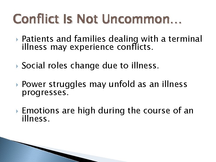 Conflict Is Not Uncommon… Patients and families dealing with a terminal illness may experience conflicts. Social roles change due to illness. Power struggles may unfold as an illness progresses. Emotions are high during the course of an illness.