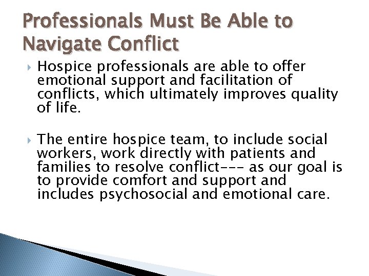 Professionals Must Be Able to Navigate Conflict Hospice professionals are able to offer emotional support and facilitation of conflicts, which ultimately improves quality of life. The entire hospice team, to include social workers, work directly with patients and families to resolve conflict--- as our goal is to provide comfort and support and includes psychosocial and emotional care.