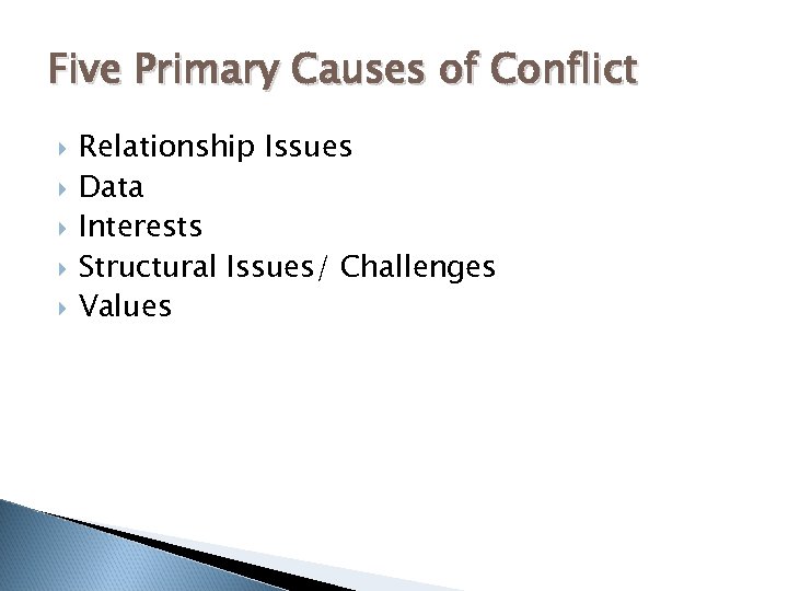 Five Primary Causes of Conflict Relationship Issues Data Interests Structural Issues/ Challenges Values