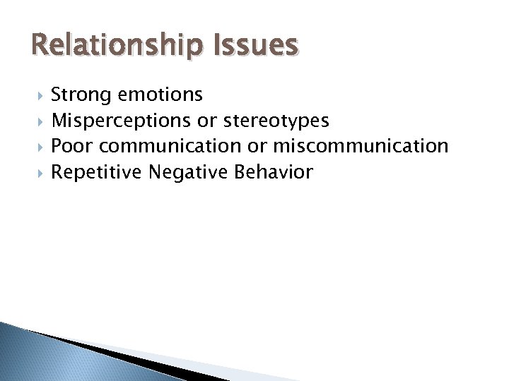 Relationship Issues Strong emotions Misperceptions or stereotypes Poor communication or miscommunication Repetitive Negative Behavior