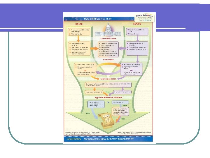 How a Bill Becomes a Law l Final l Bill must pass both houses in identical forms l l steps Conference committee Presidential action Sign to become law l Keep bill for 10 days without signing, if Congress in session it becomes law l Veto l Pocket veto (last 10 days of session) l
