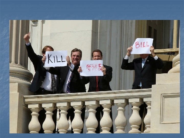 How a Bill Becomes a Law n Step 13 – The Senate n Whole Senate Debates n. No Rules Committee, so no limits on time or amendments n. Filibuster – talking at length to stall action on a bill, can only be ended by cloture (60 votes) n. Riders – amendments that have nothing to do with a bill