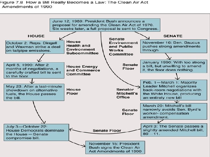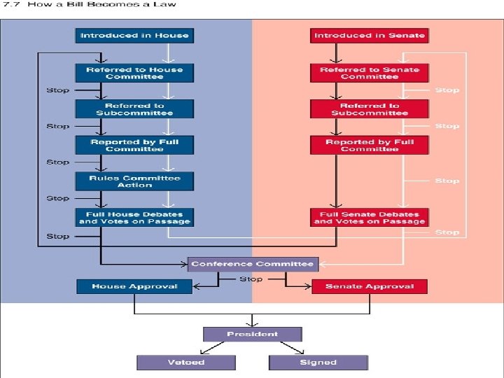 Lawmaking • Only a member of the House or Senate may introduce a bill but anyone can write a bill. • Over 9, 000 bills are proposed and fewer than 5 to 10% are enacted. • Most bills originate in the executive branch. • A bill must survive three stages to become a law: committees, the floor, and the conference committee. A bill can die at any stage.