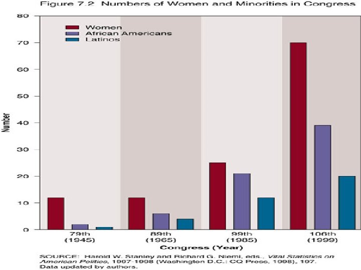 Members of Congress • Congress is older, better educated, whiter, and richer than most of us. • However, great strides have been made. Currently, both California senators are women. • Can a man represent a woman? • Can a white person adequately represent the views of a black person?