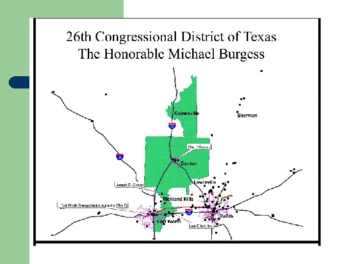 Who Represents Us? l House – – l UNT is in the 26 th Congressional District for Texas Michael Burgess, R Senate – Kay Bailey Hutchison, R (1993 - ? ) l – Reelected in 2006 John Cornyn, R (2002 - ? ) l Up for election in 2008