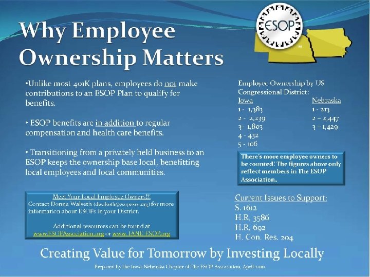 Other key items: • Find the contact person (Administrator, Scheduler or Aide) of the Congressman's or Senators office nearest you. – Discuss best time for a visit – Be flexible • Write a letter • Prepare a one page handout on your company and ESOP • Get employee owners involved – Queue up employee owners to share stories • Take pictures • Send out press release announcing the visit • Follow- up letter after visit – Visit them in DC while at ESOP Annual Conference