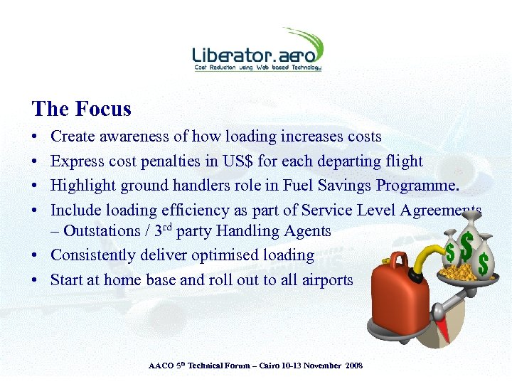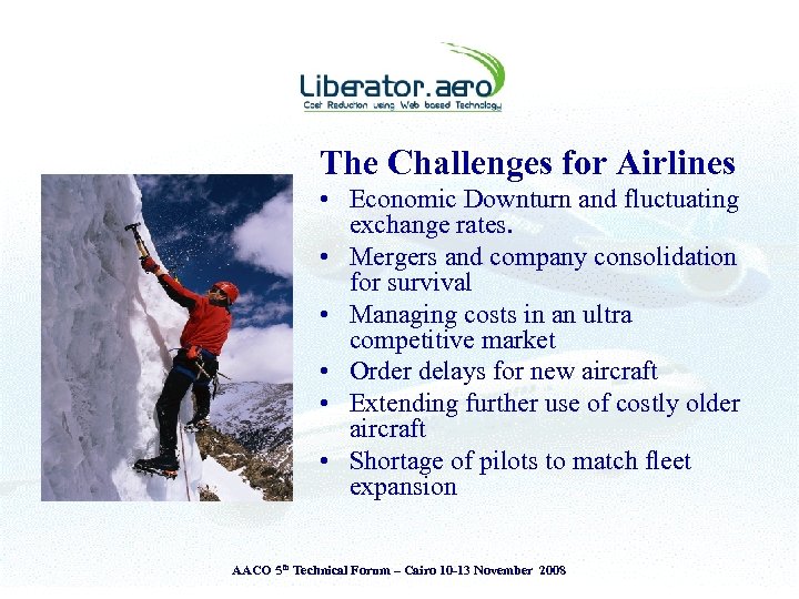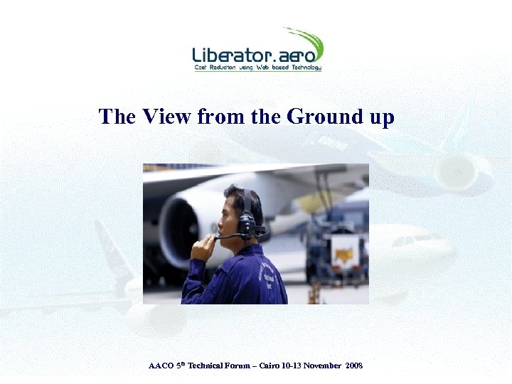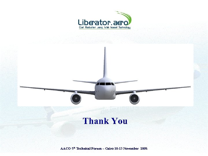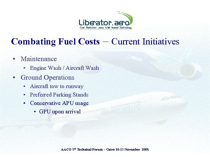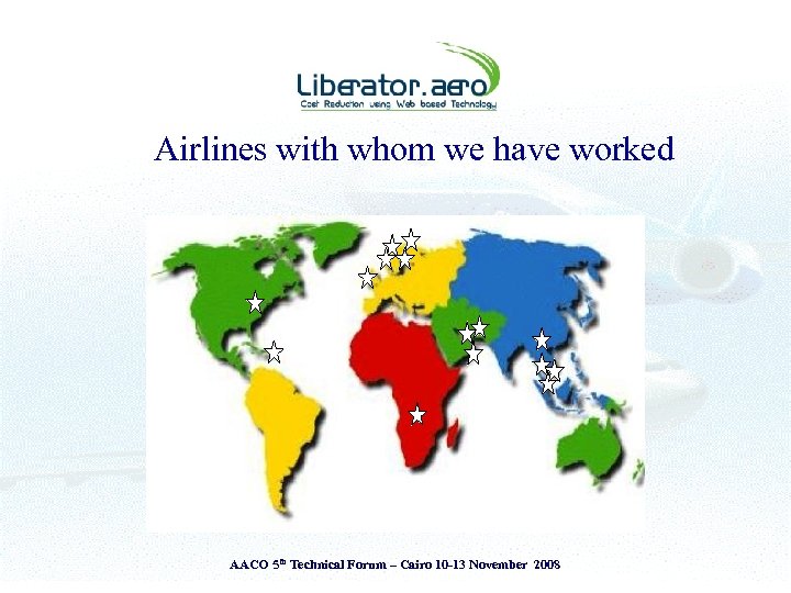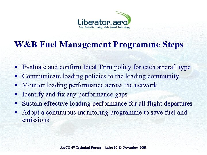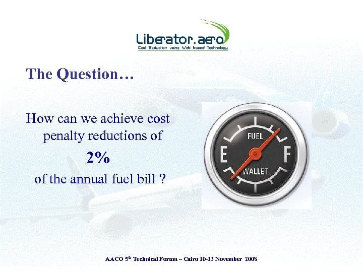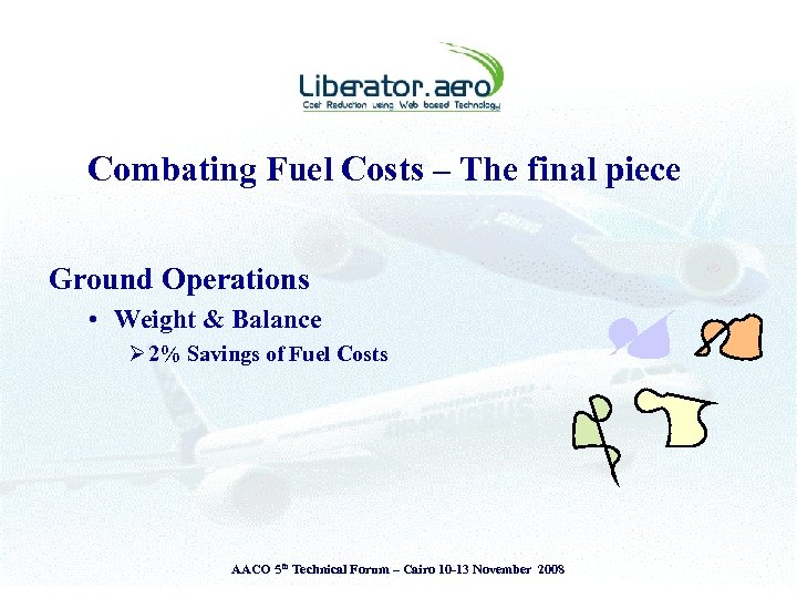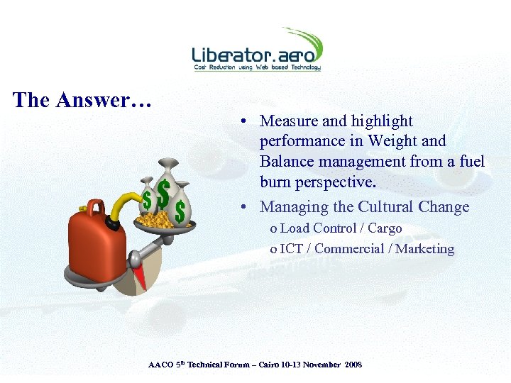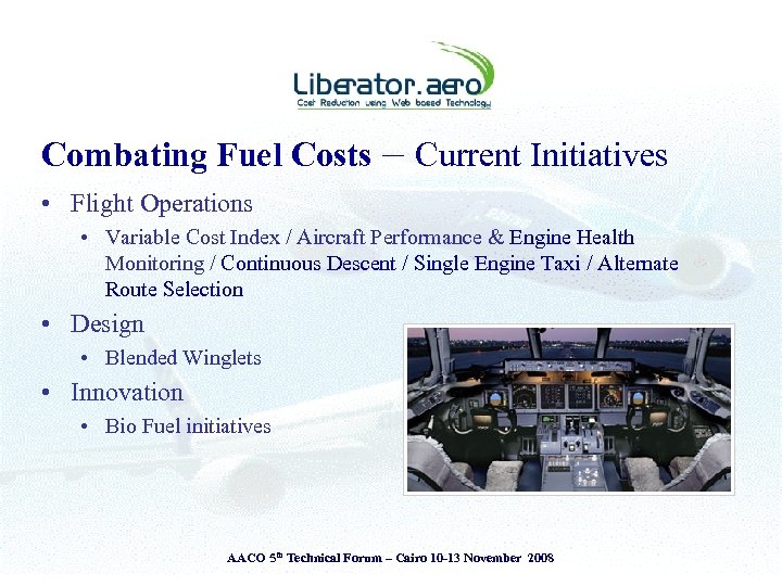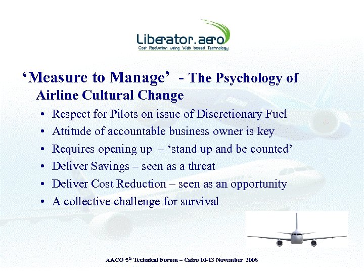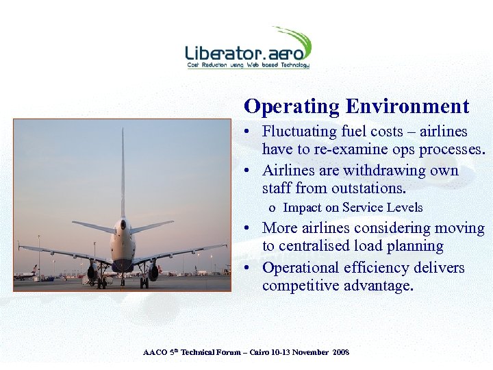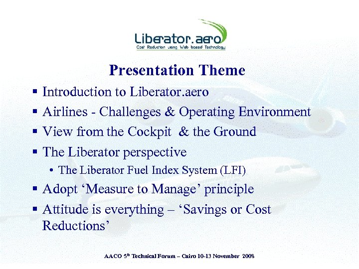 Presentation Theme § § Introduction to Liberator. aero Airlines - Challenges & Operating Environment View from the Cockpit & the Ground The Liberator perspective • The Liberator Fuel Index System (LFI) § Adopt ‘Measure to Manage’ principle § Attitude is everything – ‘Savings or Cost Reductions’ AACO 5 th Technical Forum – Cairo 10 -13 November 2008