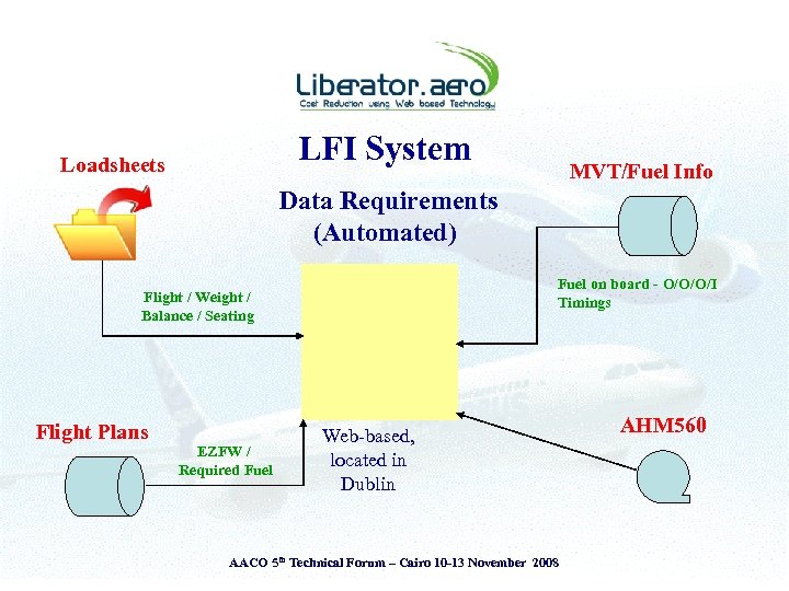 LFI System Loadsheets MVT/Fuel Info Data Requirements (Automated) Fuel on board - O/O/O/I Timings Flight / Weight / Balance / Seating Flight Plans EZFW / Required Fuel Web-based, located in Dublin AACO 5 th Technical Forum – Cairo 10 -13 November 2008 AHM 560