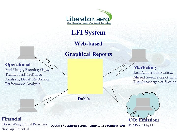LFI System Web-based Graphical Reports Operational Marketing Fuel Usage, Planning Gaps, Trends Identification & Analysis, Departure Station Performance Analysis Load/Underload Factors, Missed revenue opportunitie Fuel Surcharge verification Dublin Financial CG & Weight Cost Penalties, Savings Potential CO 2 Emissions AACO 5 th Technical Forum – Cairo 10 -13 November 2008 Per Pax / Flight