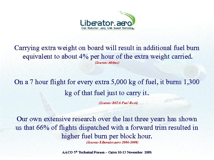 Carrying extra weight on board will result in additional fuel burn equivalent to about 4% per hour of the extra weight carried. (Source: Airbus) On a 7 hour flight for every extra 5, 000 kg of fuel, it burns 1, 300 kg of that fuel just to carry it. (Source: IATA Fuel Book) Our own extensive research over the last three years has shown us that 66% of flights dispatched with a forward trim resulted in higher fuel burn per block hour. (Source: Liberator. aero 2006 -2008) AACO 5 th Technical Forum – Cairo 10 -13 November 2008