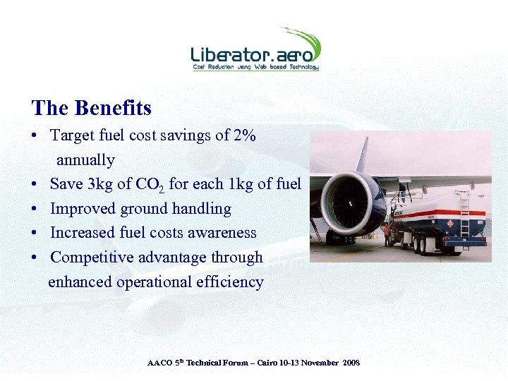 The Benefits • Target fuel cost savings of 2% annually • Save 3 kg of CO 2 for each 1 kg of fuel • Improved ground handling • Increased fuel costs awareness • Competitive advantage through enhanced operational efficiency AACO 5 th Technical Forum – Cairo 10 -13 November 2008