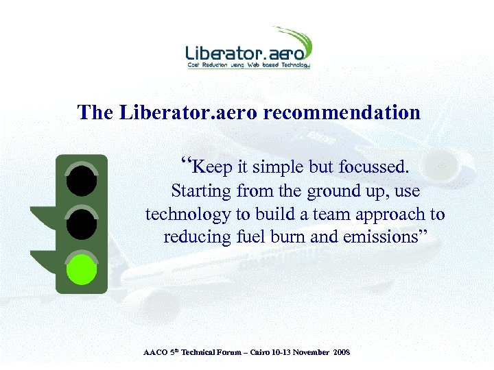 The Liberator. aero recommendation “Keep it simple but focussed. Starting from the ground up, use technology to build a team approach to reducing fuel burn and emissions” AACO 5 th Technical Forum – Cairo 10 -13 November 2008
