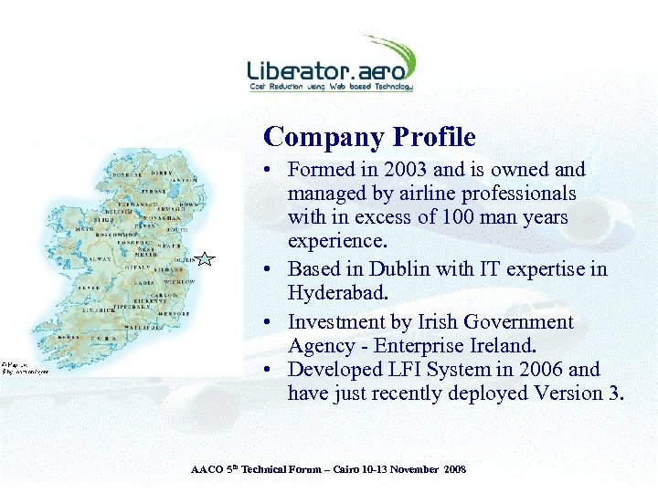 Company Profile • Formed in 2003 and is owned and managed by airline professionals with in excess of 100 man years experience. • Based in Dublin with IT expertise in Hyderabad. • Investment by Irish Government Agency - Enterprise Ireland. • Developed LFI System in 2006 and have just recently deployed Version 3. AACO 5 th Technical Forum – Cairo 10 -13 November 2008