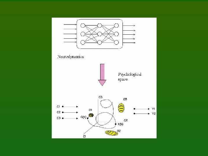 Some connections Geometric/dynamical ideas related to mind may be found in many fields: Neuroscience: D. Marr (1970) “probabilistic landscape”. C. H. Anderson, D. C. van Essen (1994): Superior Colliculus PDF maps S. Edelman: “neural spaces”, object recognition, global representation space approximates the Cartesian product of spaces that code object fragments, representation of similarities is sufficient. Psychology: K. Levin, psychological forces. G. Kelly, Personal Construct Psychology. R. Shepard, universal invariant laws. P. Johnson-Laird, mind models. Folk psychology: to put in mind, to have in mind, to keep in mind (mindmap), to make up one's mind, be of one mind. . . (space).