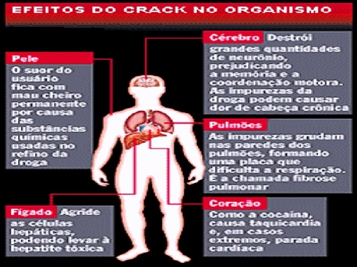 Ø O crack provoca lesões no cérebro, causando perda de função e de neurônios. Isso resulta em deficiências de memória, concentração, oscilações de humor, baixo limite para frustrações e dificuldade de ter relacionamentos afetivos.
