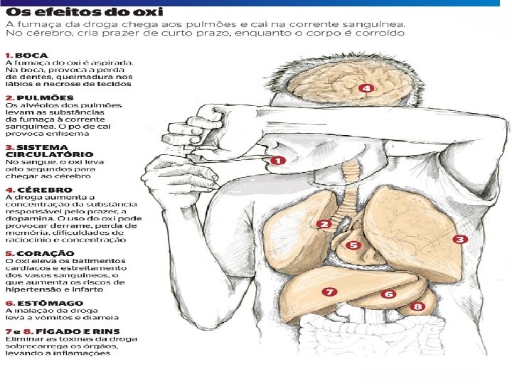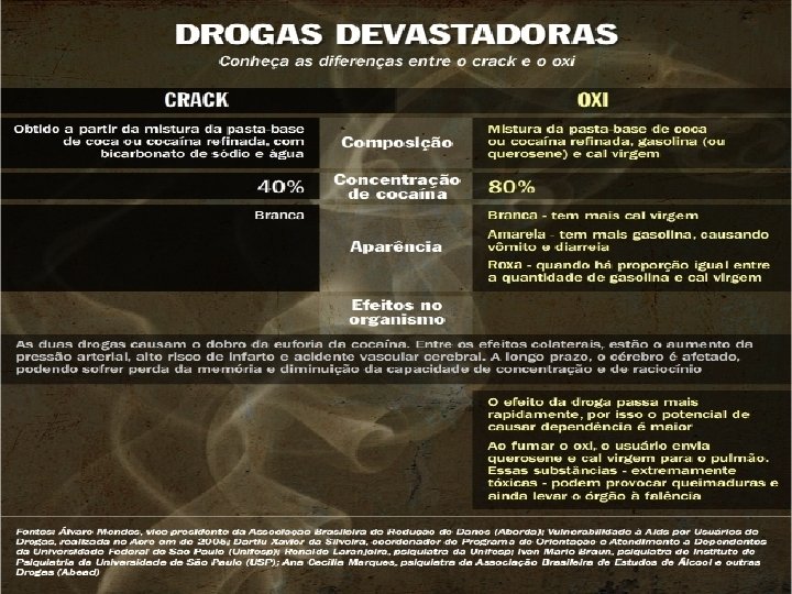 OXI/OXICIDADO Ø Não bastasse o efeito devastador do uso do crack, que tem se espalhado pelas regiões sul e sudeste do Brasil, uma nova droga foi descoberta recentemente no estado do Acre, fronteira com a Bolívia. Possivelmente uma das mais potentes e perigosas drogas conhecidas, o oxi ou oxidado, como é conhecido pelos seus usuários, é uma variante do crack. A diferença é que, na elaboração, ao invés de se acrescentar bicarbonato e amoníaco ao cloridatro de cocaína, como é o caso do crack, adicionase querosene, gasolina e cal virgem para obter o oxi.