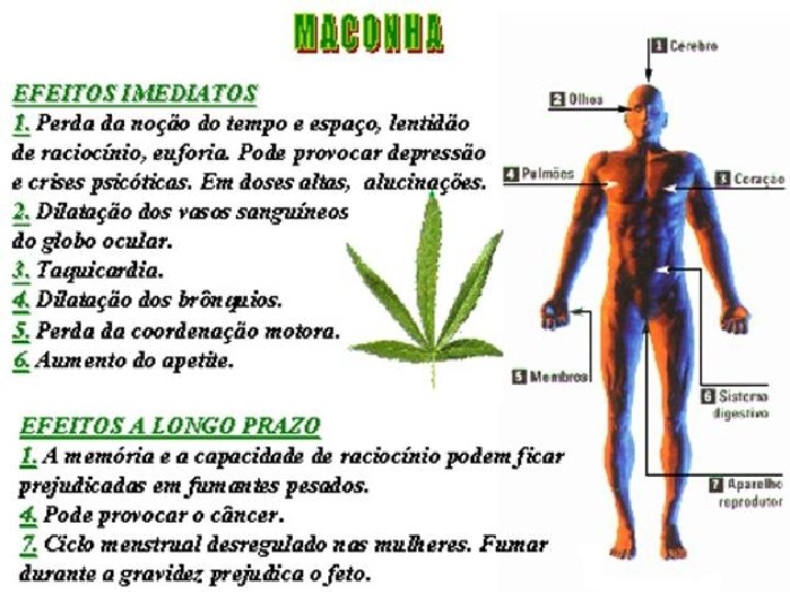 EFEITOS FÍSICOS Ø O uso e o abuso contínuo de drogas ocasionam doenças cardiorespiratórias, danos irreversíveis ao cérebro e seqüelas no aparelho digestivo, respiratório, ósseo e circulatório.