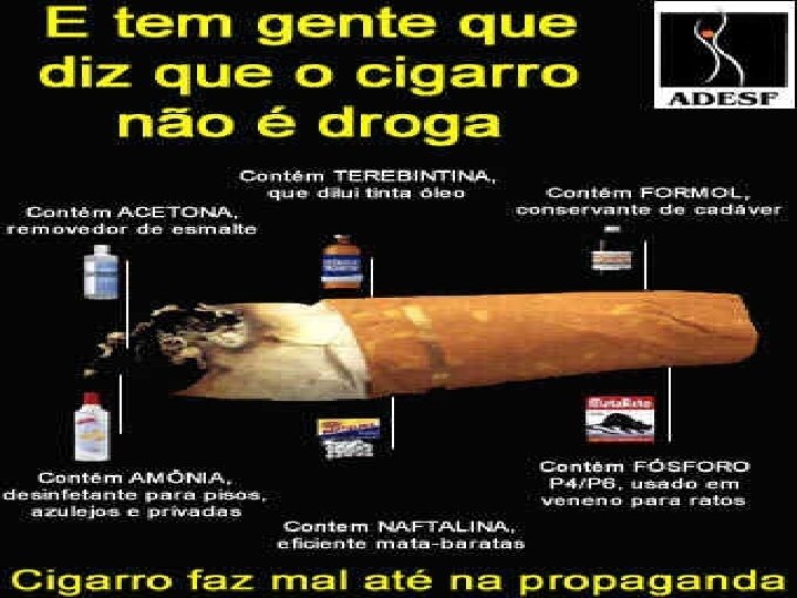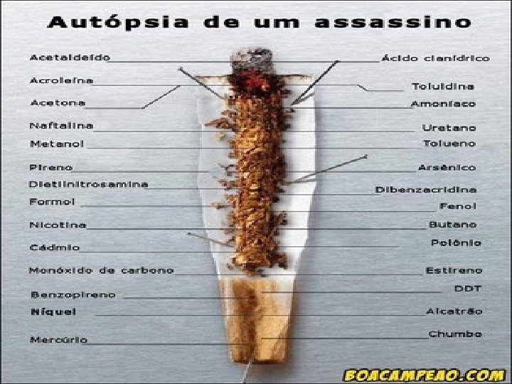 DOENÇAS PROVOCADAS PELO USO DO CIGARRO Ø Câncer de Pulmão; Câncer de Laringe; Doenças Respiratórias; Pneumonia; Sinusite; Asma; Gangrena; Impotência. Ø MÃE FUMANTE: Aborto Espontâneo; Bebê Prematuro; Fome; Deslocamento da Placenta.