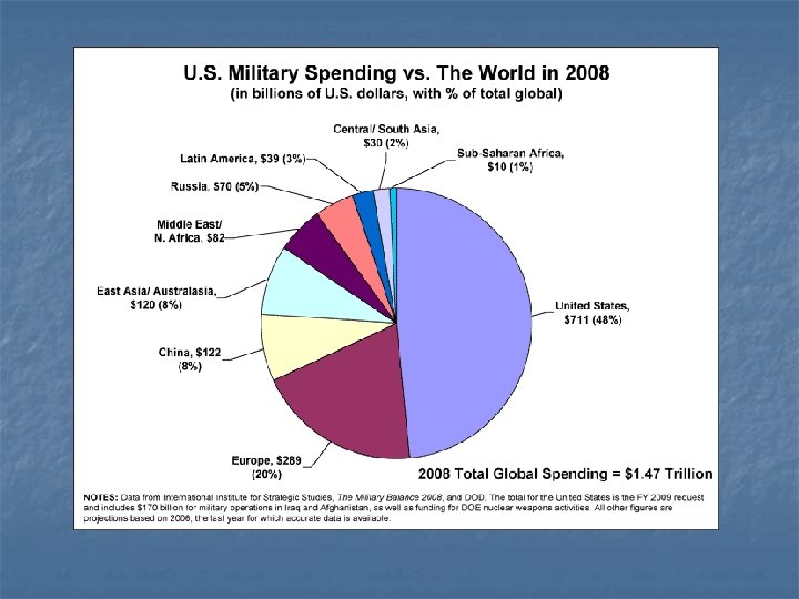 Costs of Militarization n n US: over ½ of discretionary tax dollars spent on the military US military budget represents 43% of total world military budget ($1. 5 trillion in 2009) Increased spending on nuclear weapons Inadequate spending to prevent the spread of chemical, biological, and nuclear weapons