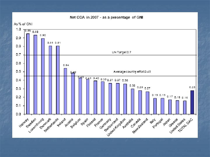 US Foreign Aid n n US ranks 21 st in the world in foreign aid as a percentage of GDP (0. 16%, versus UN recommended 0. 07%) Foreign Aid: 1/3 military n 1/3 economic n 1/3 food and development n n US world’s second largest arms exporter