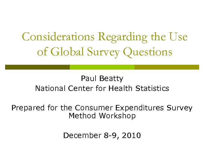Considerations Regarding the Use of Global Survey Questions Paul Beatty National Center for Health Statistics Prepared for the Consumer Expenditures Survey Method Workshop December 8 -9, 2010