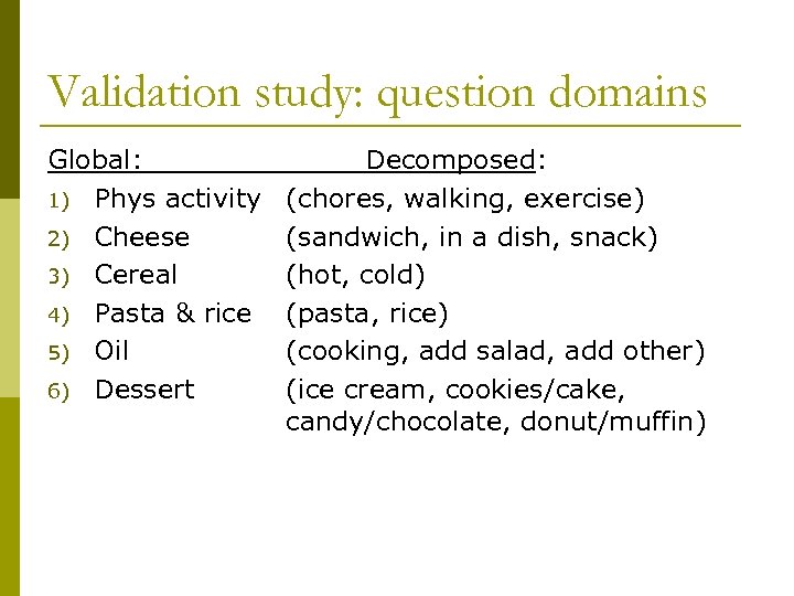 Validation study: question domains Global: 1) Phys activity 2) Cheese 3) Cereal 4) Pasta & rice 5) Oil 6) Dessert Decomposed: (chores, walking, exercise) (sandwich, in a dish, snack) (hot, cold) (pasta, rice) (cooking, add salad, add other) (ice cream, cookies/cake, candy/chocolate, donut/muffin)