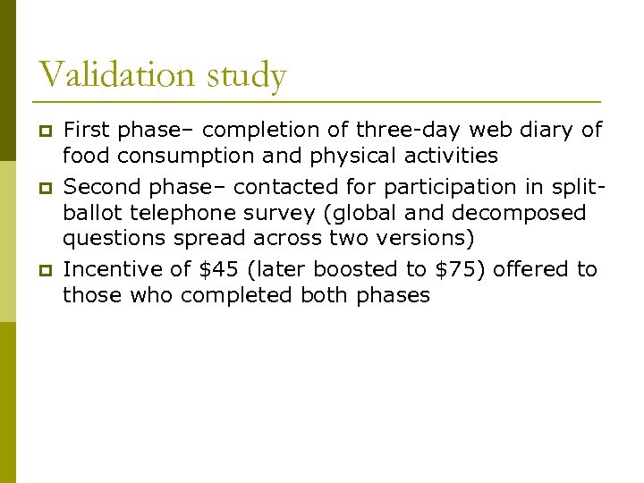 Validation study p p p First phase– completion of three-day web diary of food consumption and physical activities Second phase– contacted for participation in splitballot telephone survey (global and decomposed questions spread across two versions) Incentive of $45 (later boosted to $75) offered to those who completed both phases