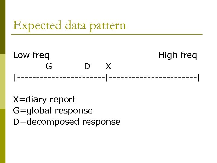 Expected data pattern Low freq High freq G D X |-----------------------| X=diary report G=global response D=decomposed response