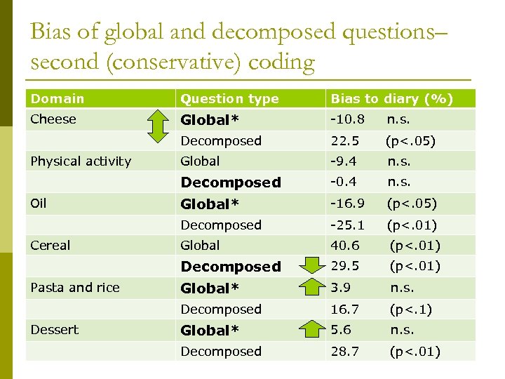 Bias of global and decomposed questions– second (conservative) coding Domain Question type Bias to diary (%) Cheese Global* -10. 8 n. s. Decomposed 22. 5 (p<. 05) Global -9. 4 n. s. Decomposed -0. 4 n. s. Global* -16. 9 (p<. 05) Decomposed -25. 1 (p<. 01) Global 40. 6 (p<. 01) Decomposed 29. 5 (p<. 01) Global* 3. 9 n. s. Decomposed 16. 7 (p<. 1) Global* 5. 6 n. s. Decomposed 28. 7 (p<. 01) Physical activity Oil Cereal Pasta and rice Dessert