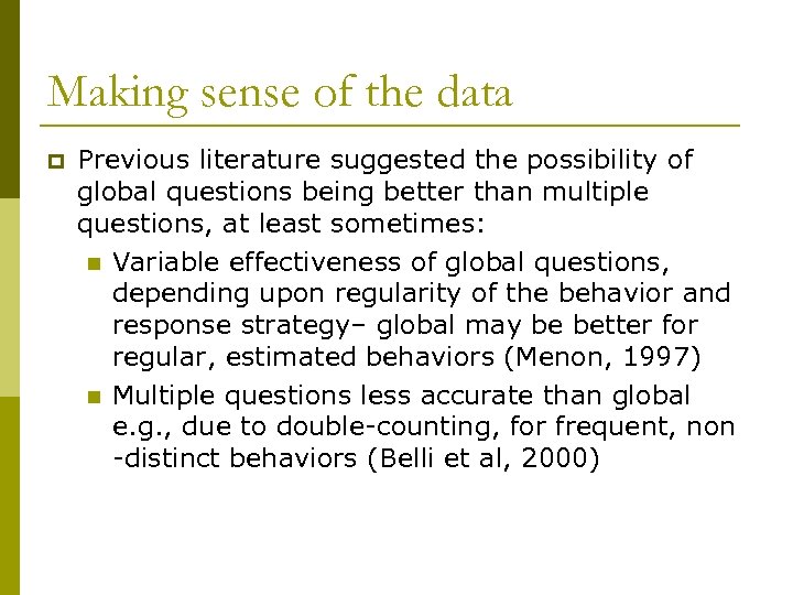 Making sense of the data p Previous literature suggested the possibility of global questions being better than multiple questions, at least sometimes: n Variable effectiveness of global questions, depending upon regularity of the behavior and response strategy– global may be better for regular, estimated behaviors (Menon, 1997) n Multiple questions less accurate than global e. g. , due to double-counting, for frequent, non -distinct behaviors (Belli et al, 2000)