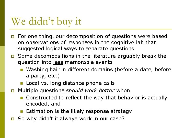 We didn’t buy it p p For one thing, our decomposition of questions were based on observations of responses in the cognitive lab that suggested logical ways to separate questions Some decompositions in the literature arguably break the question into less memorable events n Washing hair in different domains (before a date, before a party, etc. ) n Local vs. long distance phone calls Multiple questions should work better when n Constructed to reflect the way that behavior is actually encoded, and n Estimation is the likely response strategy So why didn’t it always work in our case?