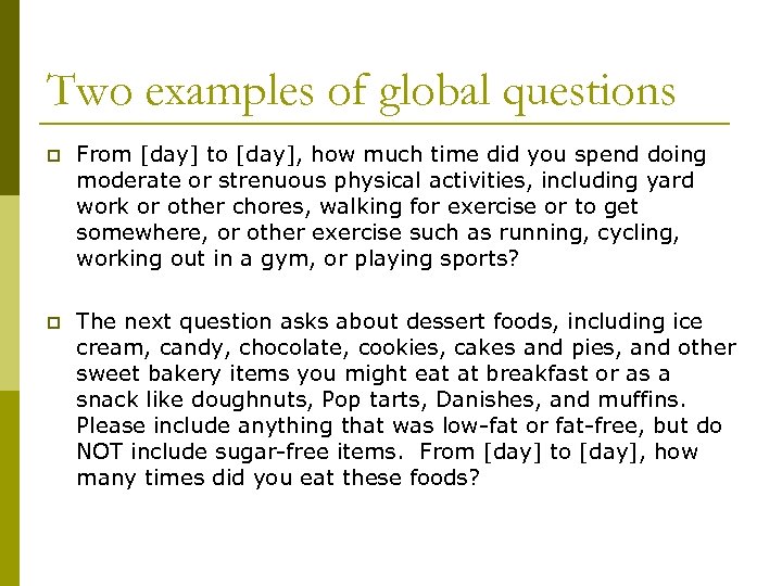 Two examples of global questions p From [day] to [day], how much time did you spend doing moderate or strenuous physical activities, including yard work or other chores, walking for exercise or to get somewhere, or other exercise such as running, cycling, working out in a gym, or playing sports? p The next question asks about dessert foods, including ice cream, candy, chocolate, cookies, cakes and pies, and other sweet bakery items you might eat at breakfast or as a snack like doughnuts, Pop tarts, Danishes, and muffins. Please include anything that was low-fat or fat-free, but do NOT include sugar-free items. From [day] to [day], how many times did you eat these foods?