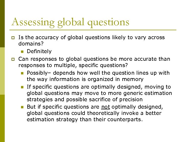 Assessing global questions p p Is the accuracy of global questions likely to vary across domains? n Definitely Can responses to global questions be more accurate than responses to multiple, specific questions? n Possibly– depends how well the question lines up with the way information is organized in memory n If specific questions are optimally designed, moving to global questions may move to more generic estimation strategies and possible sacrifice of precision n But if specific questions are not optimally designed, global questions could theoretically invoke a better estimation strategy than their counterparts.