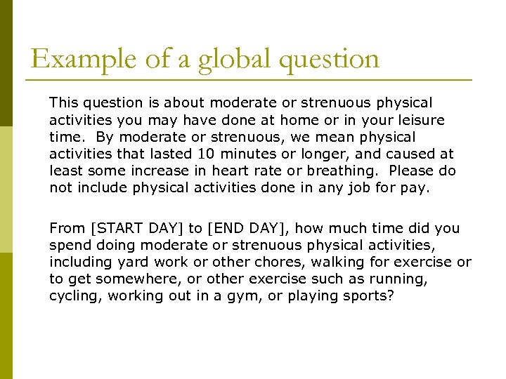 Example of a global question This question is about moderate or strenuous physical activities you may have done at home or in your leisure time. By moderate or strenuous, we mean physical activities that lasted 10 minutes or longer, and caused at least some increase in heart rate or breathing. Please do not include physical activities done in any job for pay. From [START DAY] to [END DAY], how much time did you spend doing moderate or strenuous physical activities, including yard work or other chores, walking for exercise or to get somewhere, or other exercise such as running, cycling, working out in a gym, or playing sports?