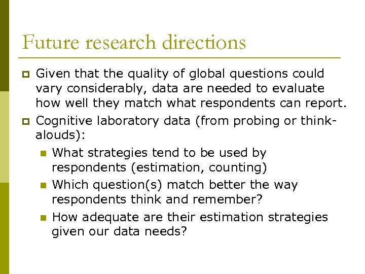 Future research directions p p Given that the quality of global questions could vary considerably, data are needed to evaluate how well they match what respondents can report. Cognitive laboratory data (from probing or thinkalouds): n What strategies tend to be used by respondents (estimation, counting) n Which question(s) match better the way respondents think and remember? n How adequate are their estimation strategies given our data needs?