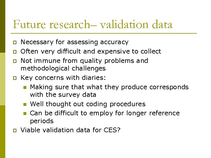 Future research– validation data p p p Necessary for assessing accuracy Often very difficult and expensive to collect Not immune from quality problems and methodological challenges Key concerns with diaries: n Making sure that what they produce corresponds with the survey data n Well thought out coding procedures n Can be difficult to employ for longer reference periods Viable validation data for CES?