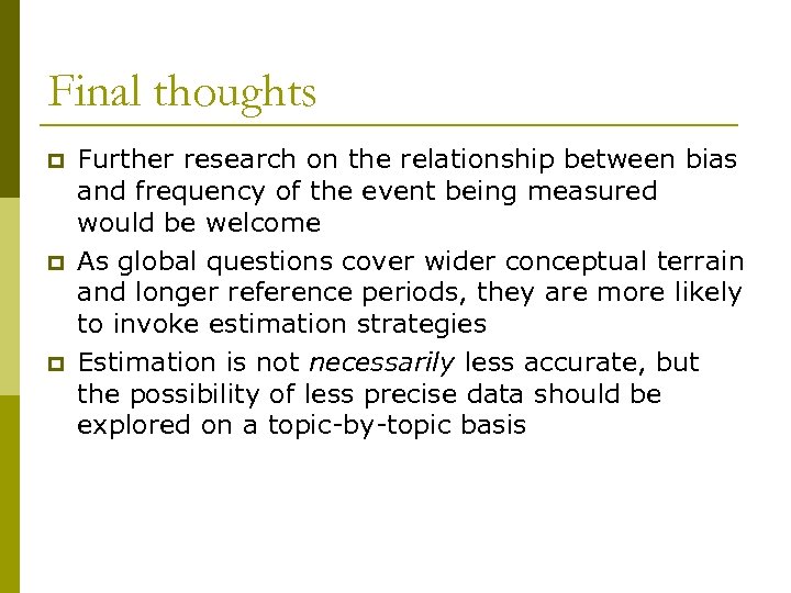 Final thoughts p p p Further research on the relationship between bias and frequency of the event being measured would be welcome As global questions cover wider conceptual terrain and longer reference periods, they are more likely to invoke estimation strategies Estimation is not necessarily less accurate, but the possibility of less precise data should be explored on a topic-by-topic basis