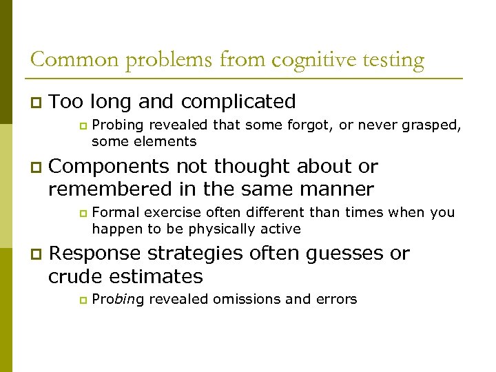 Common problems from cognitive testing p Too long and complicated p p Components not thought about or remembered in the same manner p p Probing revealed that some forgot, or never grasped, some elements Formal exercise often different than times when you happen to be physically active Response strategies often guesses or crude estimates p Probing revealed omissions and errors