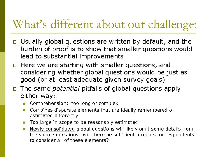 What’s different about our challenge: p p p Usually global questions are written by default, and the burden of proof is to show that smaller questions would lead to substantial improvements Here we are starting with smaller questions, and considering whether global questions would be just as good (or at least adequate given survey goals) The same potential pitfalls of global questions apply either way: n n Comprehension: too long or complex Combines disparate elements that are ideally remembered or estimated differently Too large in scope to be reasonably estimated Newly consolidated global questions will likely omit some details from the source questions– will there be sufficient prompts for respondents to consider all of these elements?