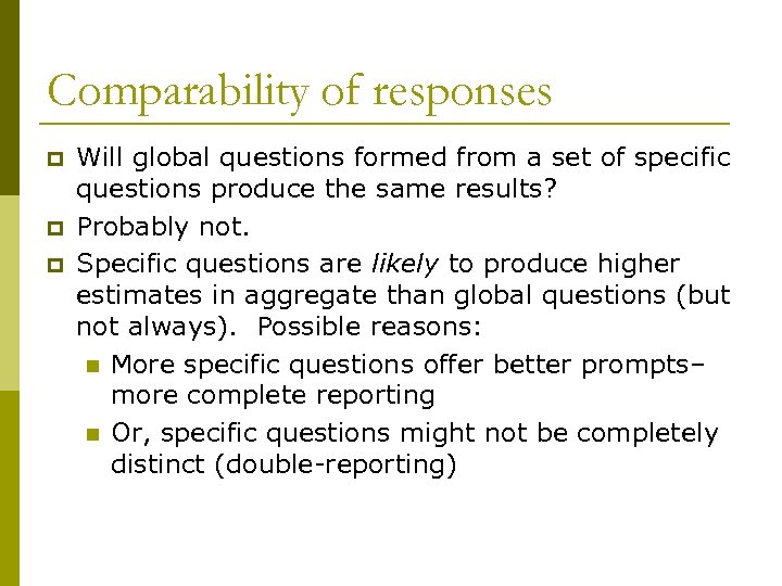 Comparability of responses p p p Will global questions formed from a set of specific questions produce the same results? Probably not. Specific questions are likely to produce higher estimates in aggregate than global questions (but not always). Possible reasons: n More specific questions offer better prompts– more complete reporting n Or, specific questions might not be completely distinct (double-reporting)