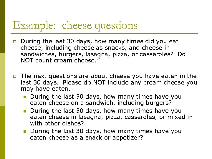 Example: cheese questions p During the last 30 days, how many times did you eat cheese, including cheese as snacks, and cheese in sandwiches, burgers, lasagna, pizza, or casseroles? Do NOT count cream cheese. ” p The next questions are about cheese you have eaten in the last 30 days. Please do NOT include any cream cheese you may have eaten. n During the last 30 days, how many times have you eaten cheese on a sandwich, including burgers? n During the last 30 days, how many times have you eaten cheese in lasagna, pizza, casseroles, or mixed in with other dishes? n During the last 30 days, how many times have you eaten cheese as a snack or appetizer?