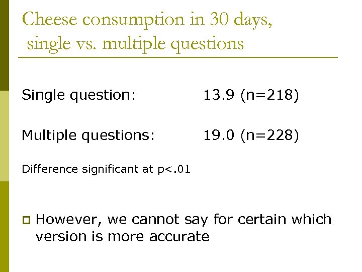 Cheese consumption in 30 days, single vs. multiple questions Single question: 13. 9 (n=218) Multiple questions: 19. 0 (n=228) Difference significant at p<. 01 p However, we cannot say for certain which version is more accurate
