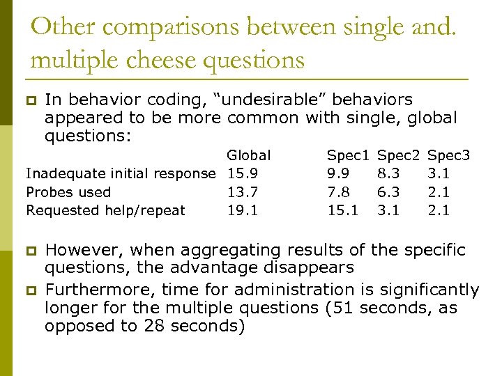 Other comparisons between single and. multiple cheese questions p In behavior coding, “undesirable” behaviors appeared to be more common with single, global questions: Global Inadequate initial response 15. 9 Probes used 13. 7 Requested help/repeat 19. 1 p p Spec 1 9. 9 7. 8 15. 1 Spec 2 8. 3 6. 3 3. 1 Spec 3 3. 1 2. 1 However, when aggregating results of the specific questions, the advantage disappears Furthermore, time for administration is significantly longer for the multiple questions (51 seconds, as opposed to 28 seconds)