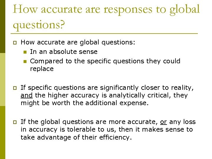 How accurate are responses to global questions? p How accurate are global questions: n In an absolute sense n Compared to the specific questions they could replace p If specific questions are significantly closer to reality, and the higher accuracy is analytically critical, they might be worth the additional expense. p If the global questions are more accurate, or any loss in accuracy is tolerable to us, then it makes sense to take advantage of their efficiency.