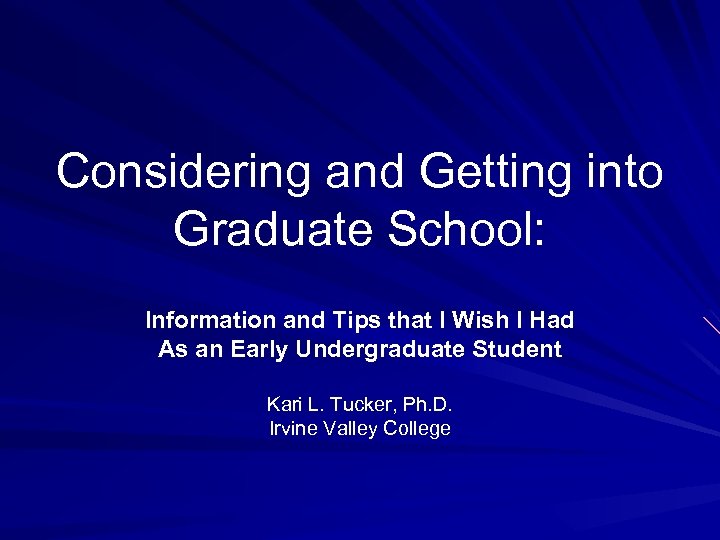 Considering and Getting into Graduate School: Information and Tips that I Wish I Had As an Early Undergraduate Student Kari L. Tucker, Ph. D. Irvine Valley College