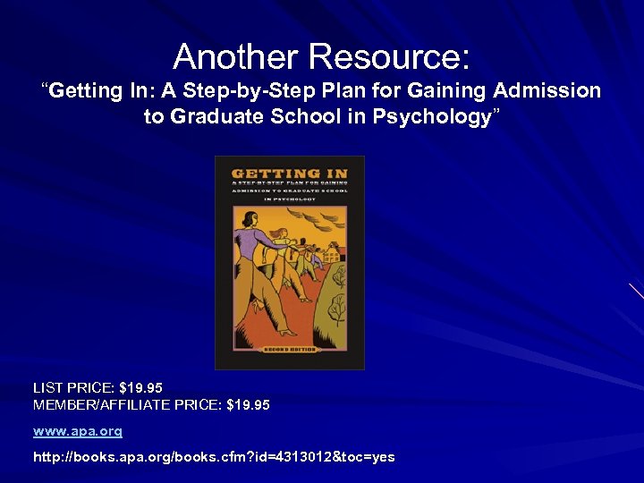 Another Resource: “Getting In: A Step-by-Step Plan for Gaining Admission to Graduate School in Psychology” LIST PRICE: $19. 95 MEMBER/AFFILIATE PRICE: $19. 95 www. apa. org http: //books. apa. org/books. cfm? id=4313012&toc=yes