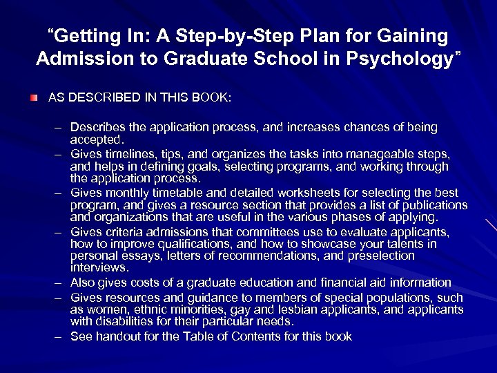 “Getting In: A Step-by-Step Plan for Gaining Admission to Graduate School in Psychology” AS DESCRIBED IN THIS BOOK: – Describes the application process, and increases chances of being accepted. – Gives timelines, tips, and organizes the tasks into manageable steps, and helps in defining goals, selecting programs, and working through the application process. – Gives monthly timetable and detailed worksheets for selecting the best program, and gives a resource section that provides a list of publications and organizations that are useful in the various phases of applying. – Gives criteria admissions that committees use to evaluate applicants, how to improve qualifications, and how to showcase your talents in personal essays, letters of recommendations, and preselection interviews. – Also gives costs of a graduate education and financial aid information – Gives resources and guidance to members of special populations, such as women, ethnic minorities, gay and lesbian applicants, and applicants with disabilities for their particular needs. – See handout for the Table of Contents for this book