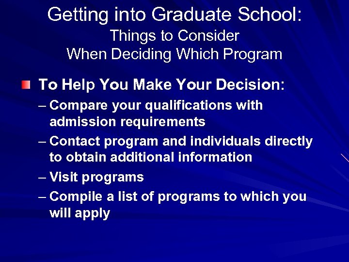 Getting into Graduate School: Things to Consider When Deciding Which Program To Help You Make Your Decision: – Compare your qualifications with admission requirements – Contact program and individuals directly to obtain additional information – Visit programs – Compile a list of programs to which you will apply