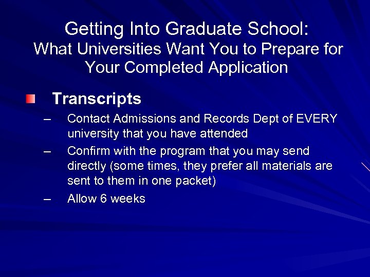 Getting Into Graduate School: What Universities Want You to Prepare for Your Completed Application Transcripts – – – Contact Admissions and Records Dept of EVERY university that you have attended Confirm with the program that you may send directly (some times, they prefer all materials are sent to them in one packet) Allow 6 weeks